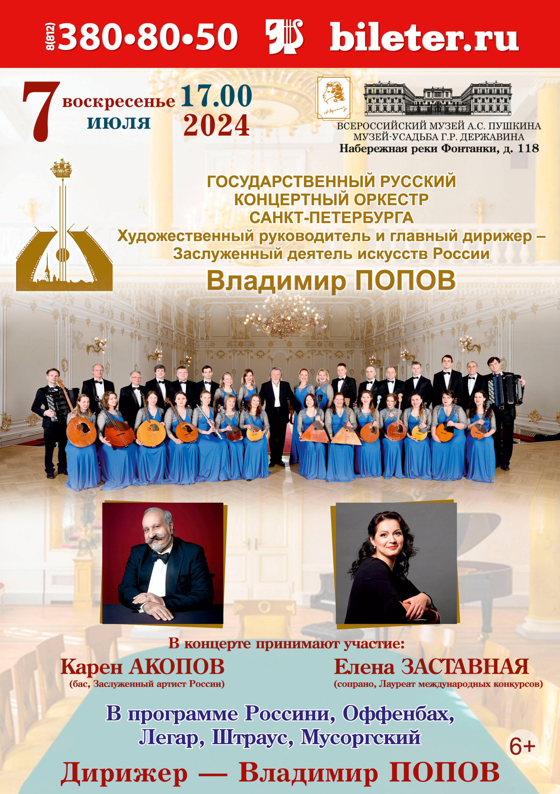 Концерт Государственного Русского концертного оркестра Санкт-Петербурга, художественный руководитель и главный дирижер – Заслуженный деятель искусств России Владимир ПОПОВ.В завершении сезона белых ночей, в красивейшем зале Санкт-Петербурга прозвучат бессмертные шедевры Россини, Штрауса, Оффенбаха, Легара в исполнении солистов петербургских музыкальных театров Елены Заставной и Карена Акопова.