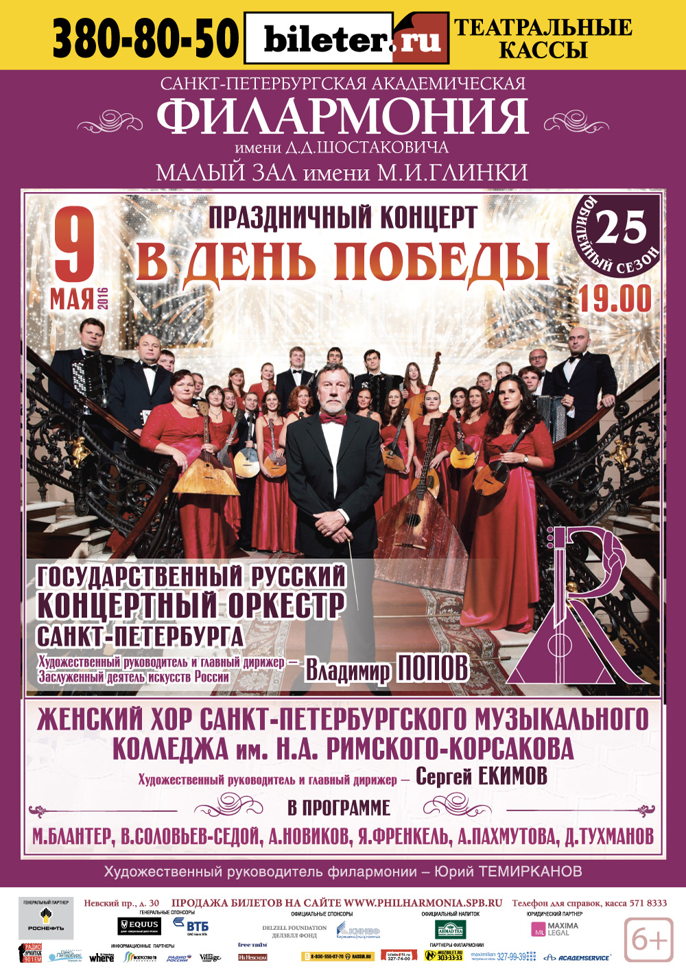 9 мая 2016 года в 19.00 на сцене Малого зала Санкт-Петербургской Филармонии состоится праздничный концерт Государственного Русского концертного оркестра Санкт-Петербурга (художественный руководитель и главный дирижер Владимир Попов) и Женского хора Санкт-Петербургского музыкального колледжа им. Н.А.Римского-Корсакова (художественный руководитель и главный дирижер Сергей Екимов).