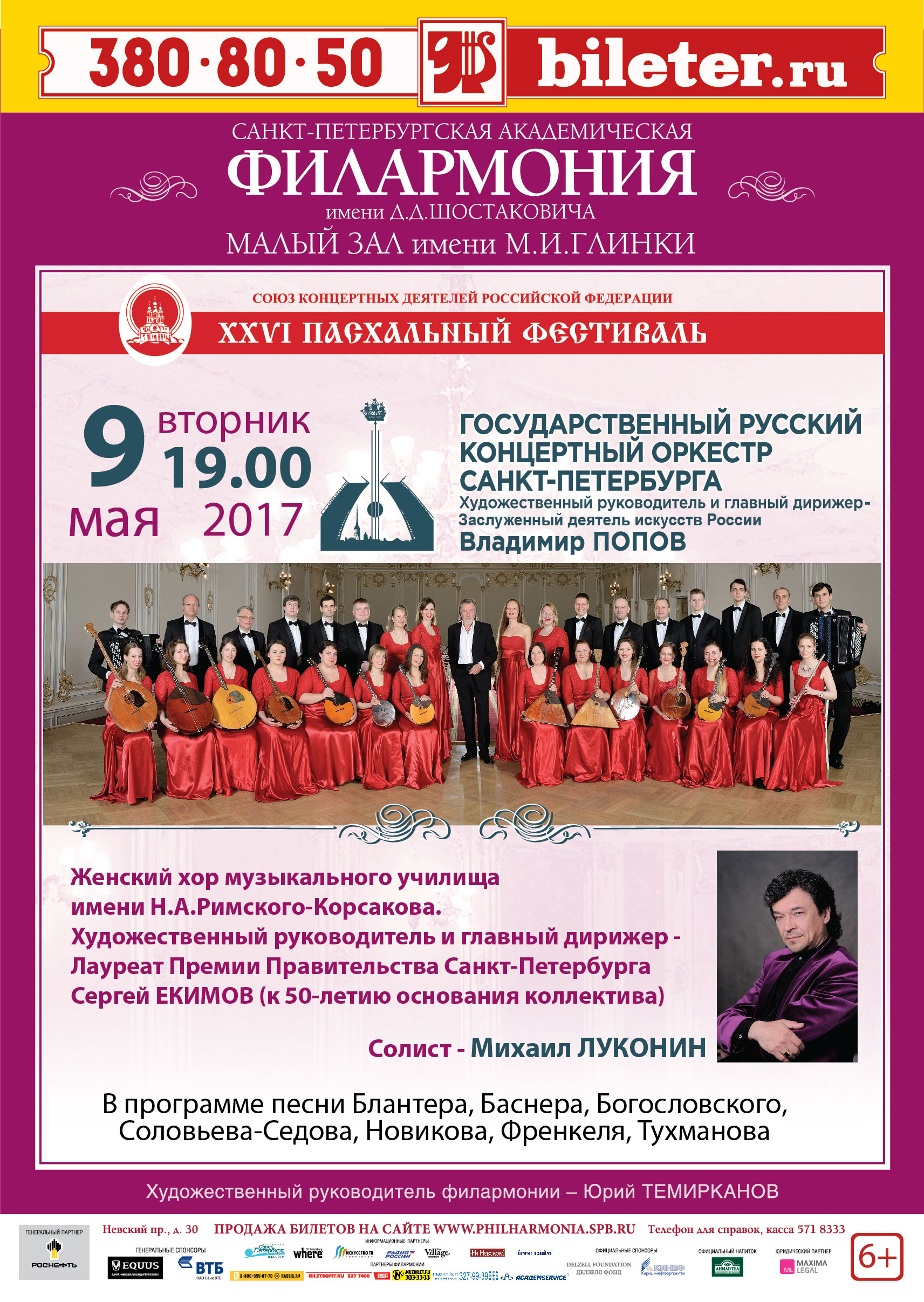 9 мая 2017 года в 19.00 на сцене Малого зала Санкт-Петербургской Филармонии состоится концерт Государственного Русского концертного оркестра Санкт-Петербурга (художественный руководитель и главный дирижер Владимир Попов) и Женского хора Санкт-Петербургского музыкального училища им. Н.А. Римского-Корсакова (художественный руководитель и главный дирижер – Лауреат премии Правительства Санкт-Петербурга Сергей Екимов). Солист — Михаил Луконин (баритон).