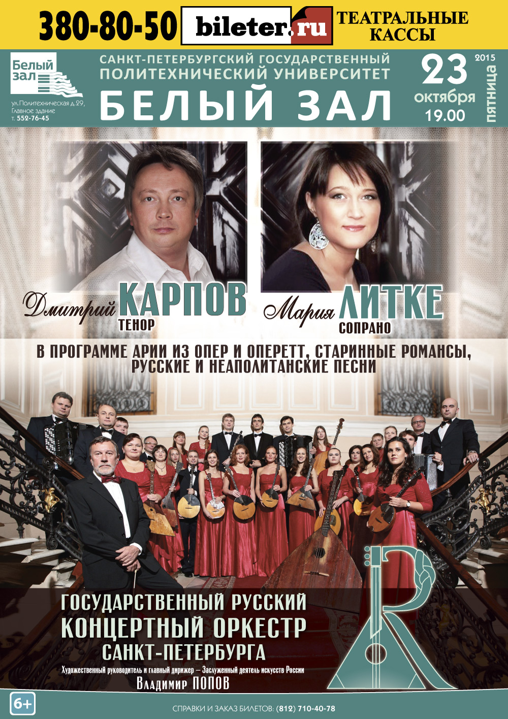 23 октября 2015 года в Белом зале Санкт-Петербургского Государственного Политехнического Университета состоится концерт известных петербургских оперных певцов Дмитрия Карпова (тенор) и Марии Литке (сопрано) в сопровождении Государственного Русского концертного оркестра Санкт-Петербурга под управлением Владимира Попова.