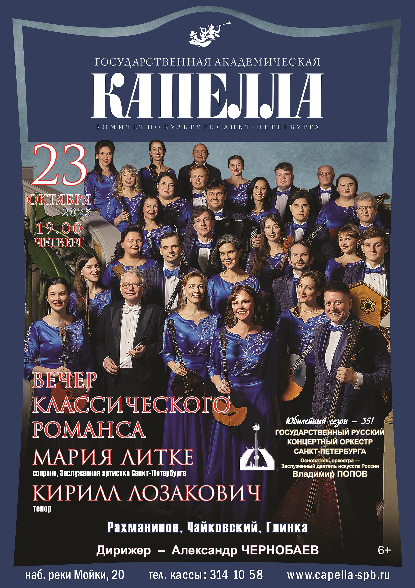 В исполнении солистки Михайловского театра МАРИИ ЛИТКЕ (сопрано), КИРИЛЛА ЛОЗАКОВИЧА (тенор) и Государственного Русского концертного оркестра Санкт-Петербурга (основатель — Заслуженный деятель искусств России Владимир ПОПОВ) прозвучат бессмертные романсы Глинки, Чайковского, Рахманинова.