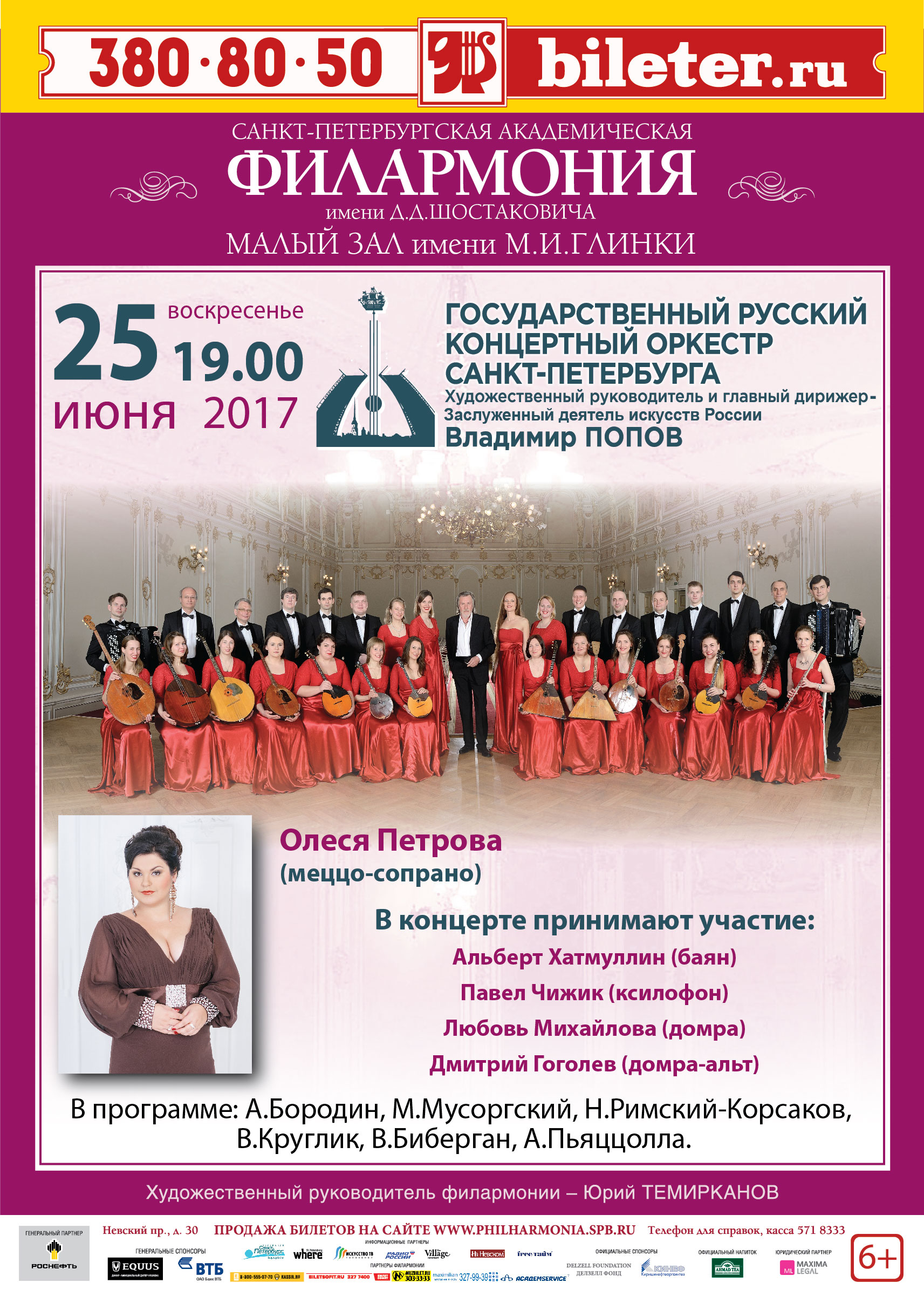25 июня 2017 года в 19.00 на сцене Малого зала Санкт-Петербургской филармонии состоится концерт Государственного Русского концертного оркестра Санкт-Петербурга под управлением Заслуженного деятеля искусств России Владимира Попова.Большим сборным концертом ГРКО закрывает концертный сезон 2016/2017 гг. В этот вечер с оркестром выступит целая плеяда молодых и уже широко известных солистов Петербурга – обладательница роскошного меццо-сопрано Олеся Петрова, многократный лауреат звания Гран-При на международных конкурсх баянист Альберт Хатмуллин, виртуозный ксилофонист Павел Чижик, блистательные исполнители на домре Любовь Михайлова и Дмитрий Гоголев.