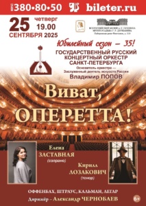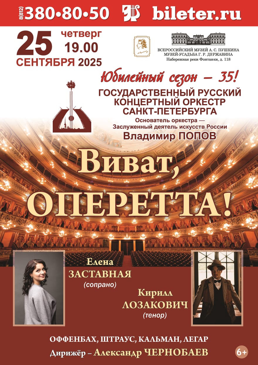 В изысканной атмосфере концертного зала музея-усадьбы Г.Р. Державина прозвучат легендарные и любимые всеми шедевры великих композиторов: Имре Кальмана, Франца Легара, Иоганна Штрауса, Жака Оффенбаха и других. Исполнителями станут талантливые солисты петербургских театров: Елена Заставная, Кирилл Лозакович и Государственный Русский концертный оркестр Санкт-Петербурга (основатель — Заслуженный деятель искусств России Владимир ПОПОВ).Елена ЗАСТАВНАЯ — сопрано, ведущая солистка театра «Зазеркалье», обладательница множества наград на международных конкурсах, чья яркая вокальная манера мгновенно покоряет слушателей!Кирилл ЛОЗАКОВИЧ — тенор, лауреат международных конкурсов, известный своей харизматичностью и виртуозной вокальной техникой!